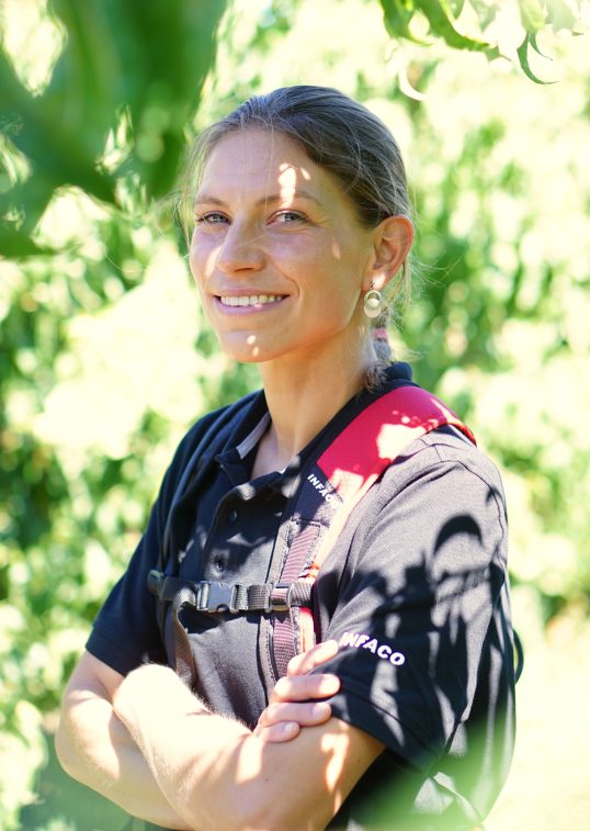 Domitille Carton ist seit ihrem Studium zur Agraringenieurin leidenschaftliche Obstbäuerin und eine junge Betriebsleiterin, die sich zu 200 % für die Leistung des Obstgartens einsetzt. Die athletische 30-Jährige mit den stahlblauen Augen leitet ihre Schnitt- und Ernteteams, die sich entschlossen von einer Parzelle zur nächsten bewegen, um die 223 Hektar des Clos des Costières in Aubord im Departement Gard zu bewirtschaften. Der Betrieb wiegt 6.300 Tonnen Pfirsiche, Nektarinen und Aprikosen, die als ökologisch verantwortungsvolle Obstgärten ausgezeichnet und von der Genossenschaft Ille Fruit mit Sitz in Ille-sur-Têt im Departement Pyrénées-Orientales vermarktet werden.
