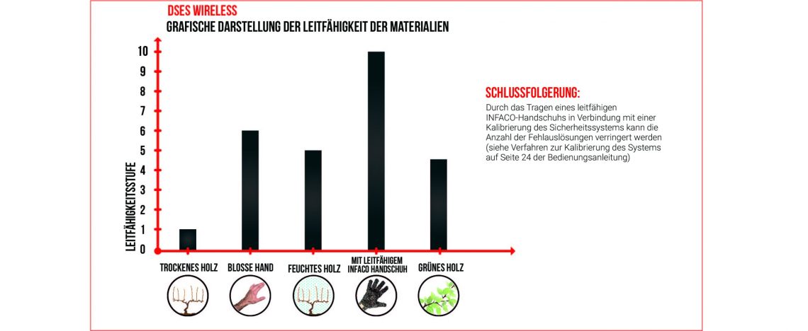 Dieser DSES funktioniert bei direktem Hautkontakt. Da jedoch jeder Mensch ein eigenes Leitfähigkeitsniveau hat und um ein hohes Niveau zu gewährleisten, empfiehlt INFACO das Tragen von leitfähigen Handschuhen. Sie erhöhen das Signal, bieten einen besseren Schutz und reduzieren Fehlauslösungen bei feuchtem Holz und/oder zu nah am Boden.