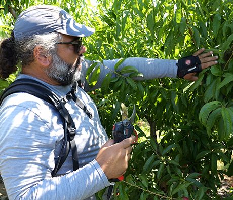 During the summer, seasonal workers are busy green pruning fruit trees. The aim is to eliminate the "gourmands" and concentrate energy on the growing fruit. It's a fine, fast operation, often carried out by two people in a row... so there's a risk of cuts, not just to oneself but also to colleagues.