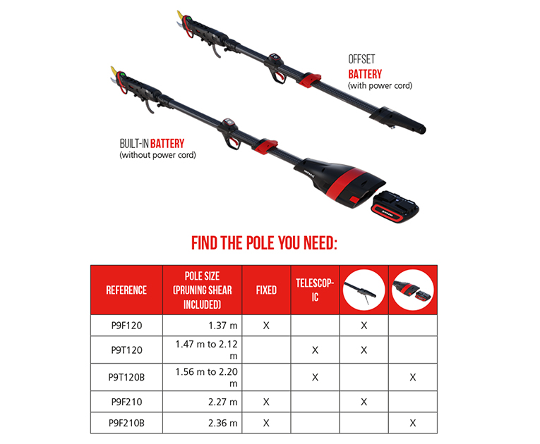To make working at height safer and easier, INFACO offers an innovative, ergonomic pole system. Simply clip the F3020 pruning shear to the end of the pole and the battery to the opposite end: balance is optimized thanks to the weight distribution on the pole. The Bluetooth wireless trigger in the sliding handle makes operation even easier.