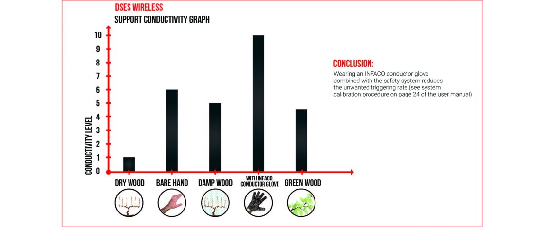 This DSES works on direct skin contact. However, as each person has his or her own level of conductivity, INFACO recommends wearing conductive gloves to guarantee a high level. They increase the signal, offer better protection and reduce accidental triggering on damp wood and/or wood too close to the ground.