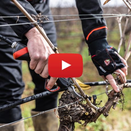 Pruner equipped with DSES Contactless in vineyard with carrying mitt - INFACO