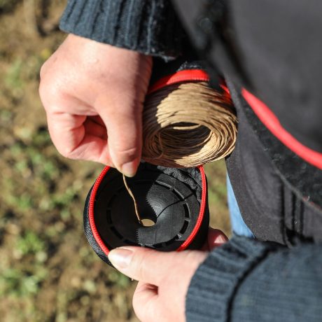 The spool, placed in its dispenser and attached to the carrying belt, holds the equivalent of at least 3000 ties. An additional spot has been designed in a pouch, also on the belt, to always have a second spool on hand. Just a few tens of seconds are enough to position a new spool in the dispenser and prime the machine.
