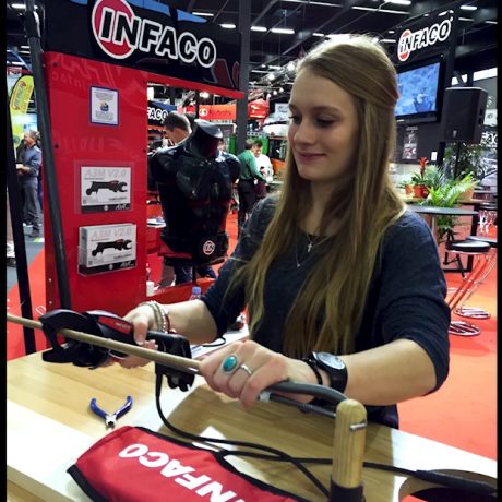 La familia no es sólo una palabra, es una inversión total. Así recuerda Angy una de sus primeras ferias: SITEVI, cuando sólo tenía 13 años. Durante el viaje de 3 horas de Cahuzac sur Vère a Montpellier, su padre (ver el vídeo sobre la historia de Davy) y Christophe Gout (ver su vídeo sobre la innovación) le enseñaron a vender tijeras de podar con un sólido discurso de ventas. Para Fabien, fue una historia ligeramente diferente y quizá más brutal: tuvo que marcharse a Estados Unidos lo antes posible para poner las cosas en su sitio y estructurarlo todo allí. Terminó sus estudios, trabajó unas semanas en el taller INFACO para formarse y luego cruzó el Atlántico en avión ¡durante 4 años!