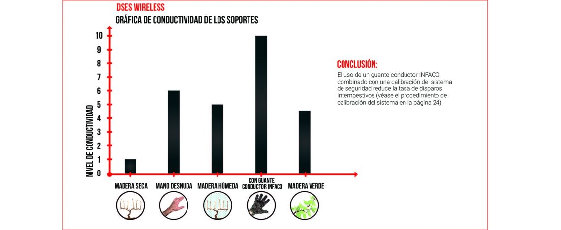 Esta DSES funciona por contacto directo con la piel. Sin embargo, cada persona tiene su propio nivel de conductividad y para garantizar un nivel elevado, INFACO recomienda llevar guantes conductores. Aumentan la señal, ofrecen una mejor protección y reducen los disparos accidentales sobre madera húmeda y/o demasiado cerca del suelo.