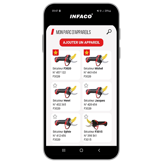 Bienvenue dans la viticulture de demain grâce aux outils connectés ! Précurseur dans le domaine de la taille, INFACO continue d’innover en proposant le premier service de taille connectée. Les deux derniers modèles de sécateurs électriques (F3015 et F3020) peuvent désormais être connectés à un smartphone.