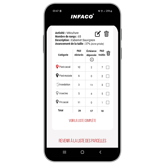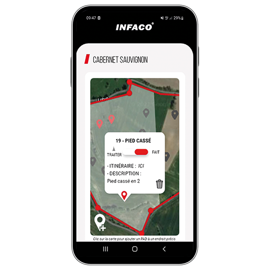 L'offre cartographie est proposée aux viticulteurs pour visualiser simplement des points à déclarer sur leur terrain (ex : pieds malades, piquets cassés ou encore fil coupé).