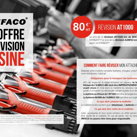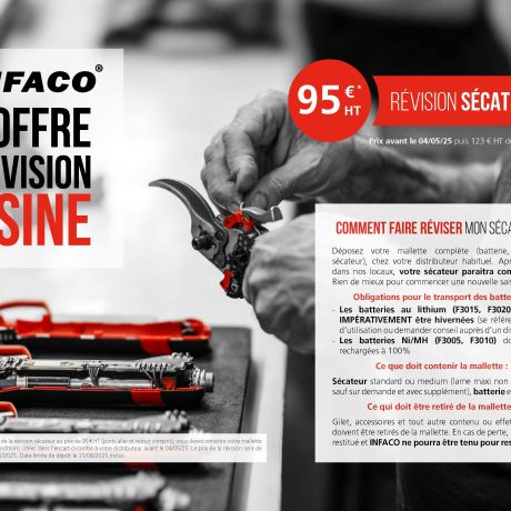 L’entreprise INFACO a mis en place différents services adaptés, pour satisfaire le client utilisateur. Parmi eux, la garantie, le service après-vente, la révision usine des sécateurs (des modèles F3005 à F3020) et des attacheuses (AT1000 et A3Mv2) et l’offre de location.
