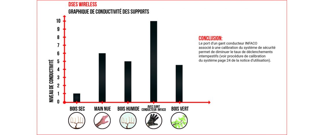 Ce DSES fonctionne au contact direct de la peau. Cependant, chaque personne possédant un niveau de conductivité qui lui et propre et pour garantir un niveau élevé, INFACO recommande le port de gants conducteurs. Ils augmentent le signal, offrent une meilleure protection et diminuent les déclenchements intempestifs sur les bois humides et/ou trop proches du sol.