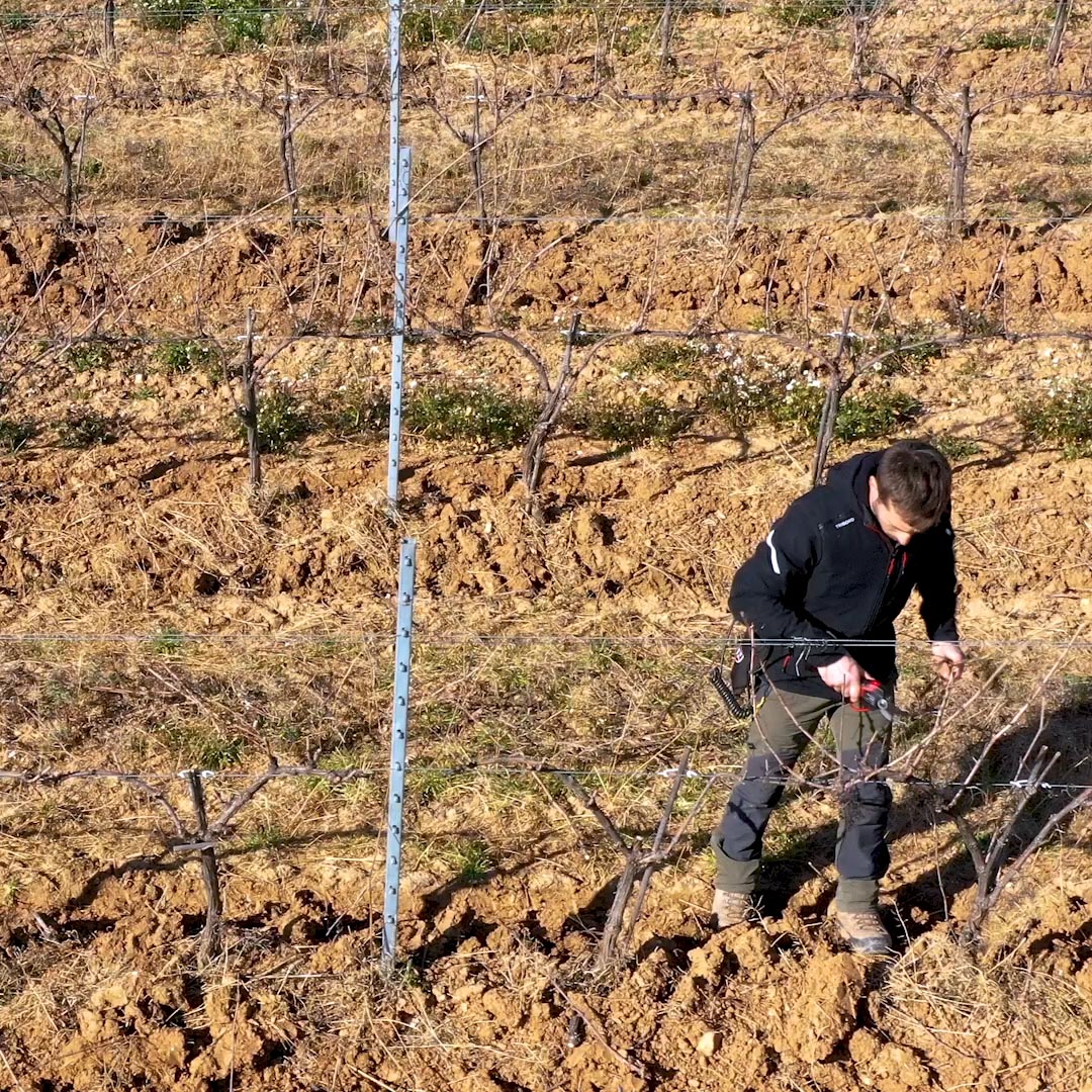 Prima di potare con le sue forbici Electrocoup di Infaco, il viticoltore inizia ad analizzare il flusso di linfa su entrambi i bracci del cordone.