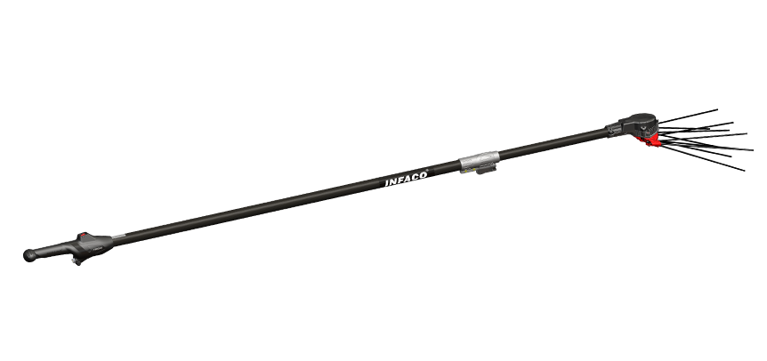 Il pettine funziona con due tipi di asta in carbonio, per raggiungere le olive più alte in tutta sicurezza, senza alcuno sforzo né piattaforma elevatrice. L'asta fissa misura 2,20 m di lunghezza, mentre quella telescopica consente di raggiungere altezze da 2,30 m a 3,30 m. Lo strumento è leggero, con un peso che varia tra i 3 kg e i 3,25 kg, a seconda dell'asta: i pesi sono distribuiti in modo ottimale per garantire il comfort dell'operatore.