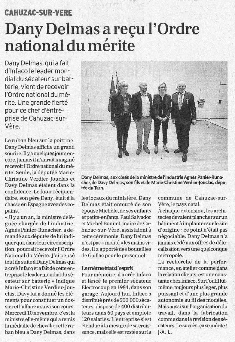 O nosso Presidente Emmanuel Macron, através de Agnès Pannier-Runacher, Ministra Delegada responsável pela Indústria no Ministério da Economia, Finanças e Recuperação, desejou nomear Dany DELMAS para o grau de Chevalier de l'Ordre National du Mérite.